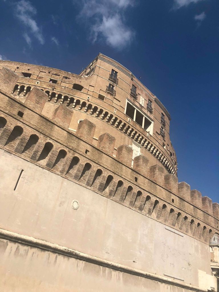 Saímos da Basílica, enviamos cartões postais pelo correio do Vaticano e fomos para o Castelo de Sant’Angelo. Começou a ser construído em 135 pelo Imperador Adriano, que pretendia usá-lo como mausoléu para sua família. Acabou se tornando um edifício militar que muitas vezes oferecia proteção para o Vaticano.