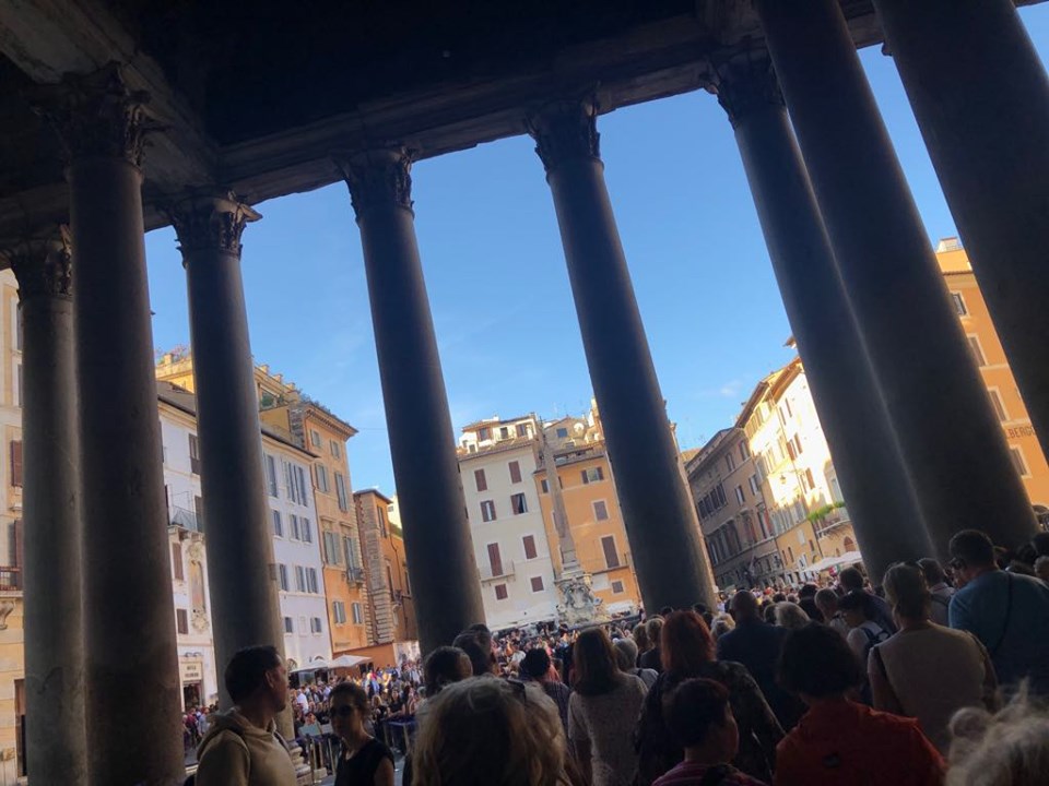 De lá, caminhamos até o Panteão, que nos deixou espantadas. O Panteão foi construído em 27 a.C, destruído por um incêndio em 80 d.C. e reconstruído no século VII. O Panteão se mantém em bom estado de conservação, sendo o monumento da Roma Antiga melhor conservado.